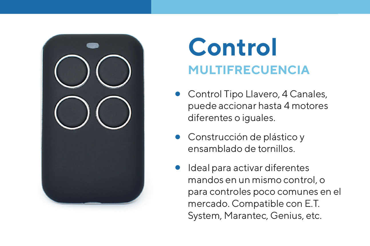 Dispositivo versátil compatible con múltiples marcas y frecuencias de garajes automáticos. Permite reemplazar varios controles en uno solo, ofreciendo comodidad, diseño moderno y excelente rendimiento.